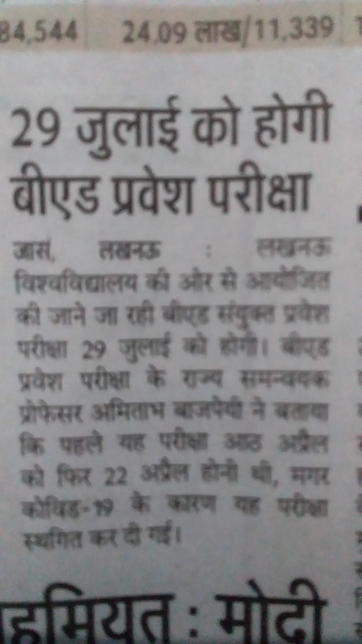 The Joint Entrance Examination of UP B.Ed. conducted by Lucknow University will be held on 29th July, 2020.