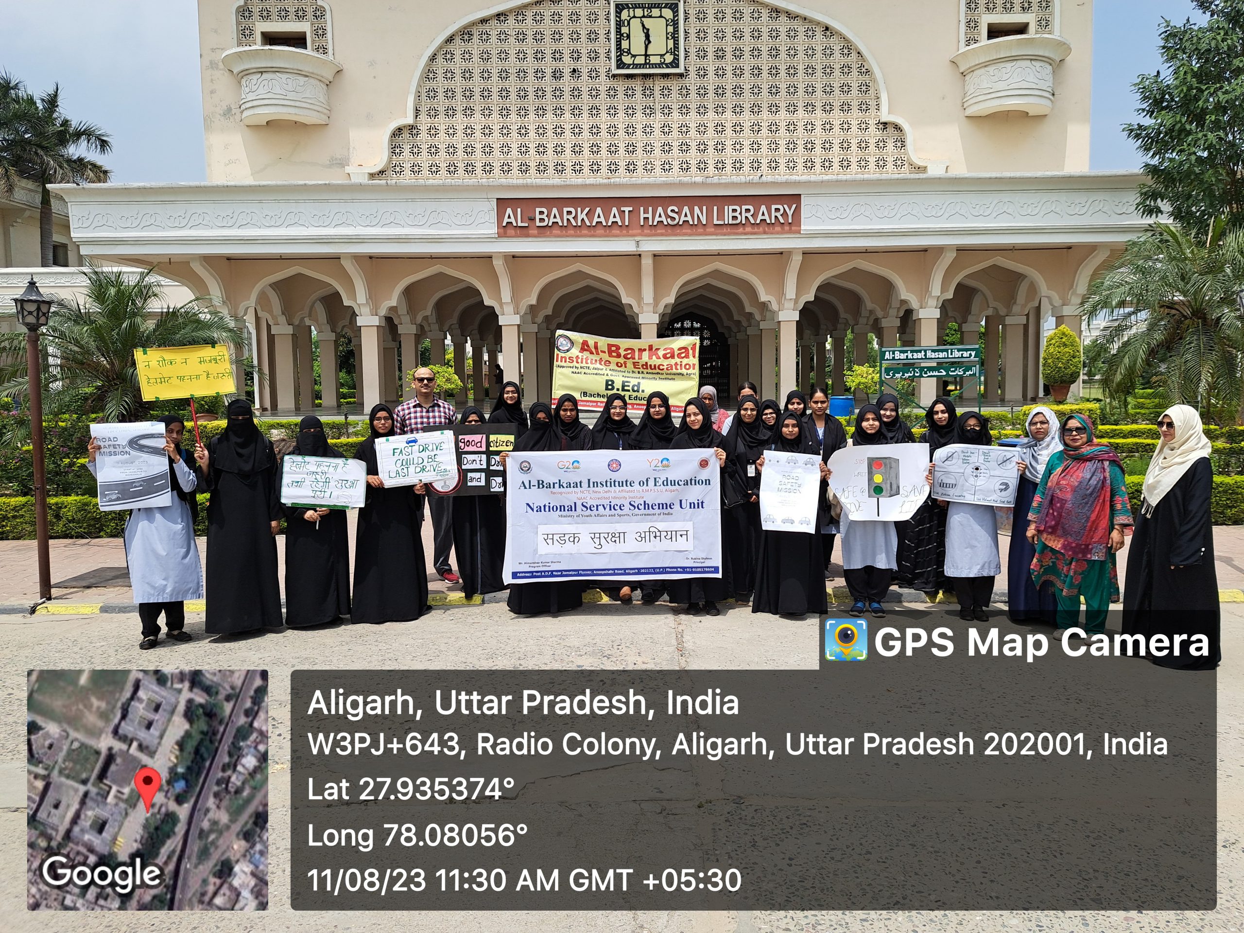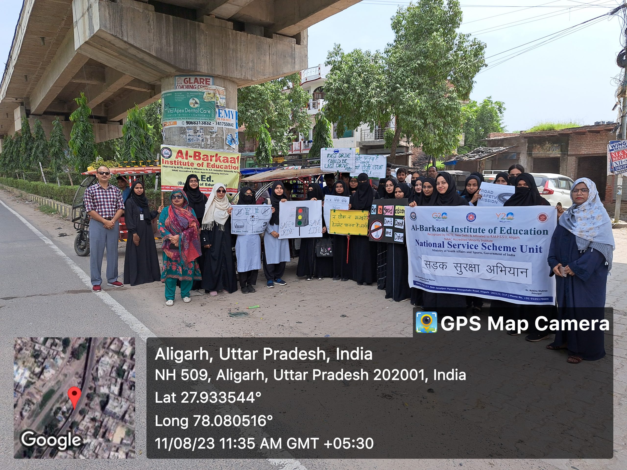 आज 11 अगस्त 2023 को ‘राष्ट्रीय सेवा योजना’ (एनएसएस) के सहयोग से अल-बरकात इंस्टीट्यूट ऑफ एजुकेशन, अलीगढ़ में एक सफल सड़क सुरक्षा अभियान का आयोजन किया गया जिसके अंतर्गत लोगों को जागरूक करने के लिए जमालपुर से महेशपुर चौराहे तक एक रैली निकाली गयी, जिसमें वाहन चालकों को सड़क सुरक्षा के संबंधित नियम बताये तथा नियमो को अनदेखा करने के कारण हर रोज होने वाली हजारों दुर्घटनाओं की जानकारी दी तथा लोगो को यातायात के नियम समझाएं, जिसके माध्यम से दुर्घटनाओं को कम किया जा सकता है जो हम सब की नैतिक जिम्मेदारी है। हमें गाड़ी चलाते समय इन बातों का ध्यान अवश्य रखना चाहिए जैसे रास्ता बदलने पर इंडिकेटर देना, ट्रैफिक सिगनल, स्पीड, सीट बेल्ट, इत्यादि। दुपहिया वाहन चलाते समय हेलमेट अवश्य पहनना चाहिए और निर्धारित गति में वाहन चलाना चाहिए।